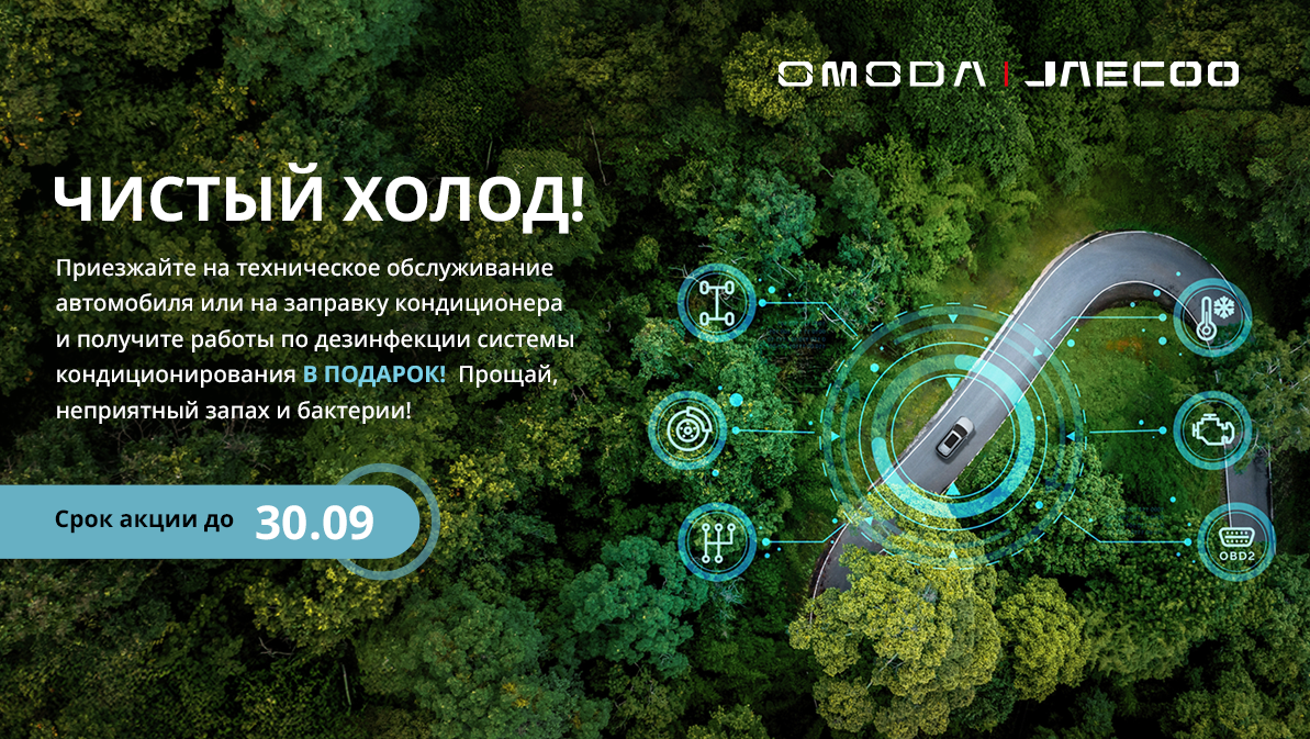 С 01.06 по 30.09 приезжайте в сервисный центр OMODA&JAECOO на техническое обслуживание автомобиля или на заправку кондиционера и получайте приятный и такой важный подарок – работы по дезинфекции системы кондиционирования!